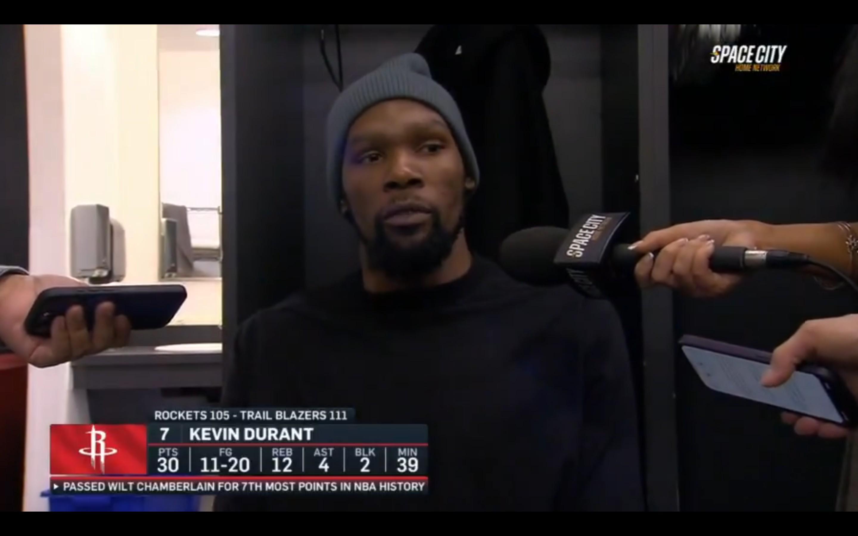 本场比赛,火箭队球星杜兰特迎来了里程碑,他超越了威尔特-张伯伦升至历史总得分榜第七位。赛后接受采访时,杜兰特也谈到了这一话题,他说道:“威尔特是我一直以来努力学习和效仿的对象。他为NBA球员树立了标杆,我很荣幸能达到他的高度,他为篮球运动所做出的贡献也激励着我。波特兰这座城市真是太有风度了,他们在那一刻认可了我,并给予我荣誉。”